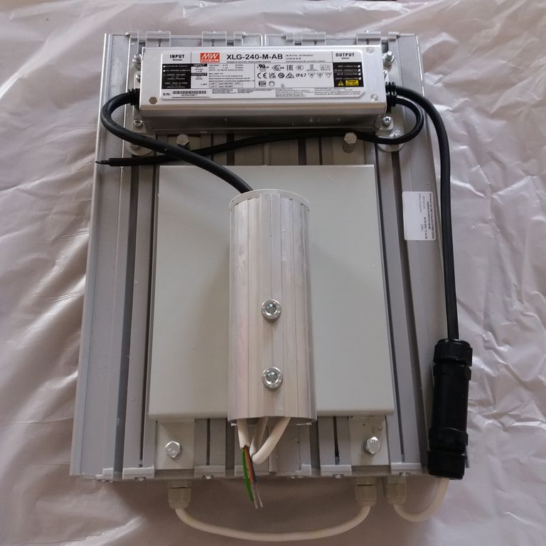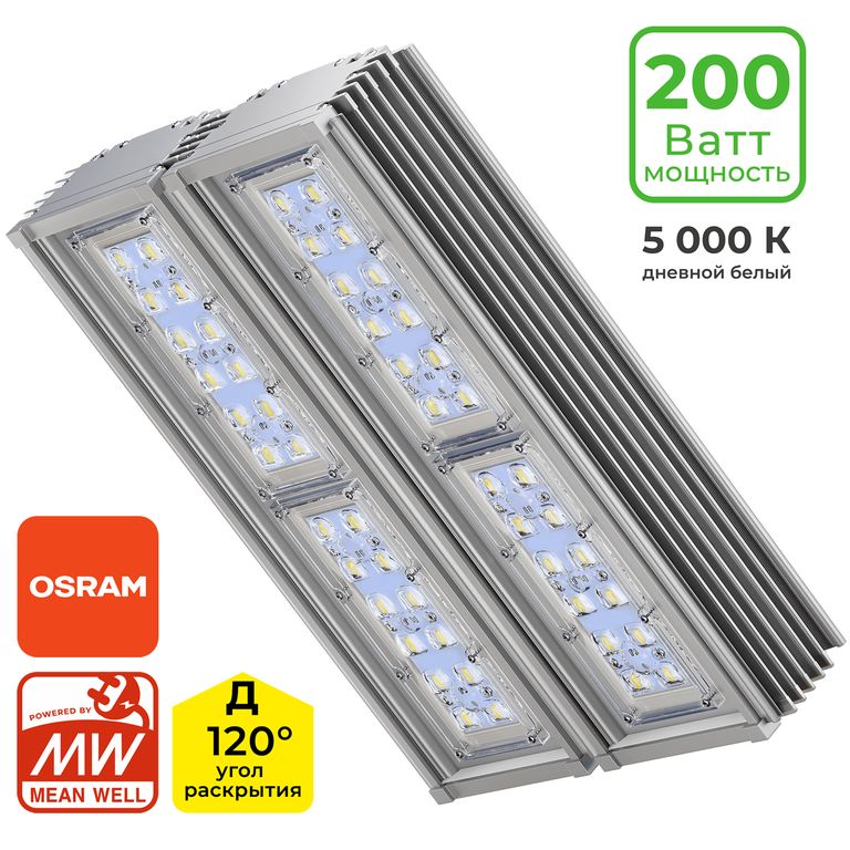 Мощность: 220 Ватт / Производительность: 34800 Лм / Цветовая температура: 5000K / Светодиод: OSRAM / КСС: C (90°) / Алюминий / ИПС MEANWELL / Светильник предназначен для режима 24/7 ГОСТ, IEC / 176-264AC/250-370DC / 100 000 часов / 5 лет / 520x280x140 / Нетто: 7 Кг