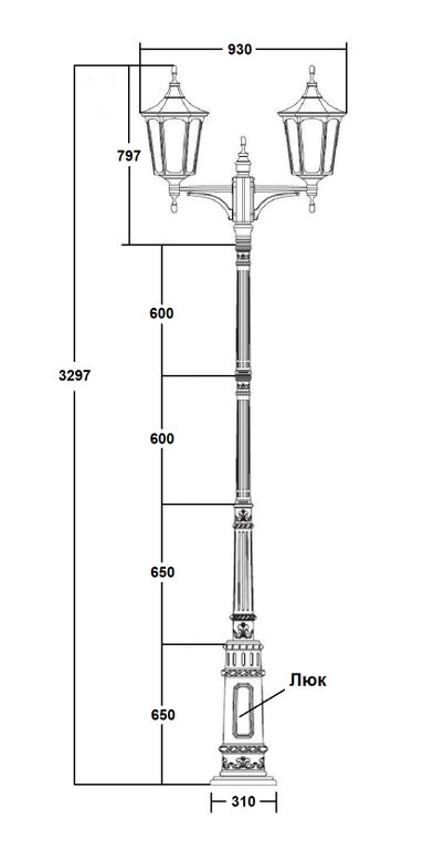 Парковая опора высотой 3,3 м в комплекте с закладной и светильниками,цвет черный